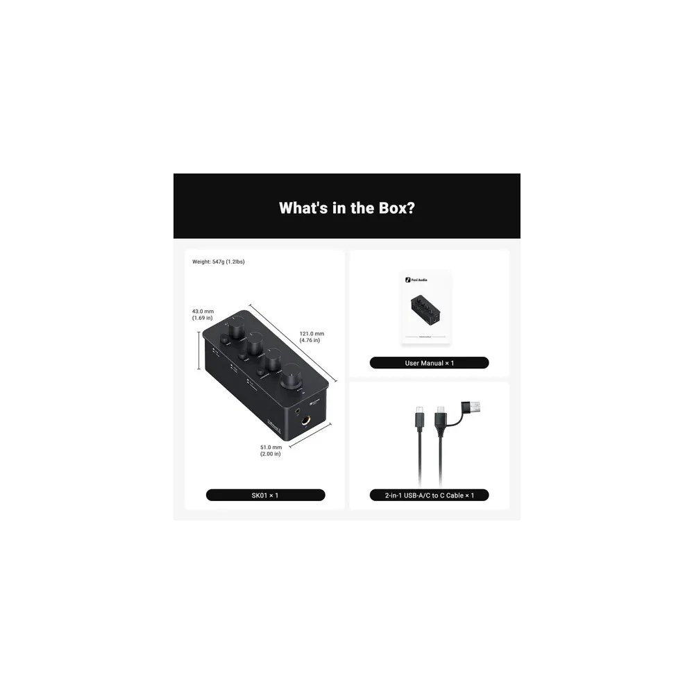 What you Get: Fosi Audio Sk01 Headphone Amp x1, User Manual x1,2-in-1 USB Type-A/C to Type-C Cable x1, an 24-month worry-free warranty and friendly customer service.