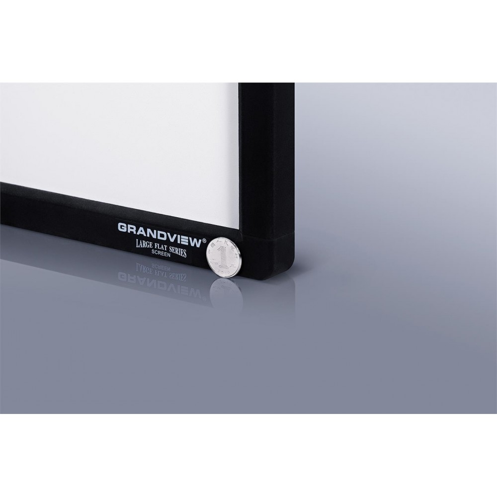 Rammelerret fra anerkjente Grandview med tynn sort ramme på kun 29 mm. Du velger størrelse mellom 80 og 150 tommer, og enten matt hvit eller matt grå fiberduk. Aspektet er 16:9. Rammen er i solid aluminium og du skrur enkelt sammen duk og ramme hjemme hos deg selv. Lerretet bygget lite ut fra vegg og ferdig montert gir lerretet inntrykk av å være en ordinær flatskjerm.