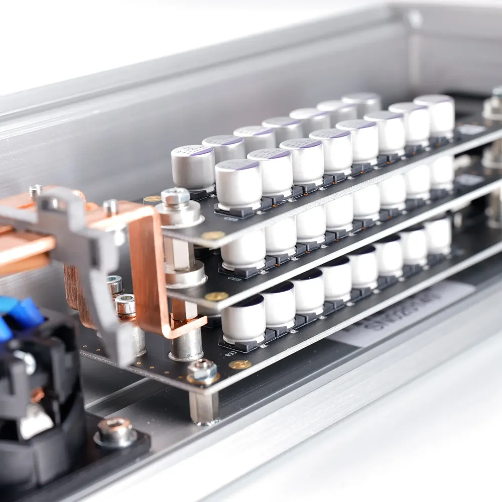 The AC-3200 was fully developed in-house – from the initial concept through prototypes to the finished product. It is manufactured in our own workshop. Inside, massive copper busbars and high-quality sockets ensure stable conductivity and reliable power distribution. The brushed aluminum housing protects the technology and represents durable quality. An integrated surge protector provides additional safety for your hi-fi components.
